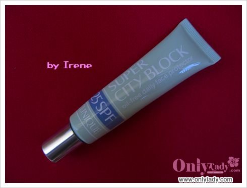 图解: 8、倩碧CITY BLOCK SPF 25 价格:RMB 200多 清爽指数:★★★ 润色指数:★★★ 舒适指数:★★★★★ 无油配方,刚用的时候简直觉得是天底下最好的防晒霜,第二年再用就感到有点油腻,从此防晒霜只用一年。不过对于没有皮肤问题的MM来说,这款防晒很值得推荐。而对于我这样稍微有那么一点点花心的mm,在用了2年之后,又转投了其它牌子。