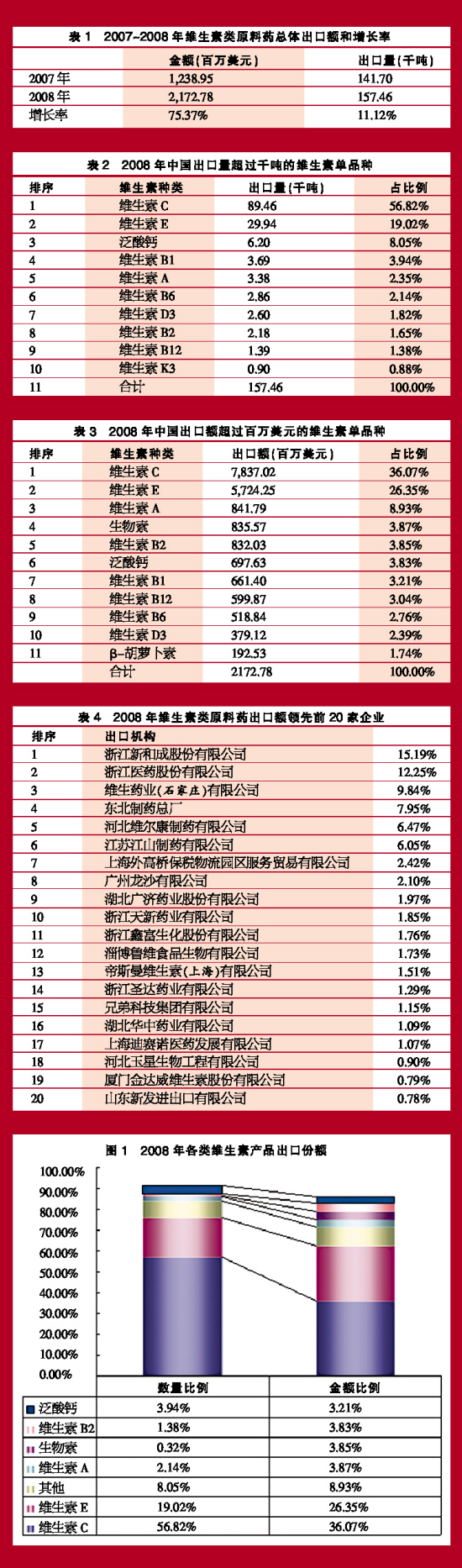 2008年维生素类产品出口总量达到157.46千吨,同比上涨11.12%;出口额近2172.78百万美元,同比上涨75.37%。其中,万吨级产品的出口数量约占76%,出口额占总额的62%以上;千吨级产品出口额占总额的35.99%。在出口品种中,维生素C和维生素E占有绝对优势,不仅在数量,而且在金额上也占有很大比重。