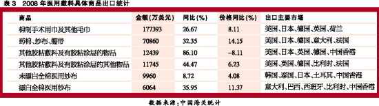 值得关注的是,由于人民币对美元的持续升值,各出口商品的价格都有不同程度的上涨,拉动了出口额的增长,如药棉、纱布、绷带类商品价格与2007年同比增长了14.14%,漂白全棉医用纱布出口平均价格同比增长了11.37%,与上半年相比,产品出口平均价格仍呈上扬趋势,但涨幅已趋缓。