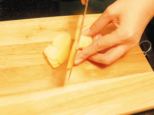 4.烧热3汤匙油,爆香姜片和蒜蓉,倒入鸡腿肉和1/3汤匙料酒炒至肉色变白。