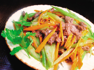 材料:西芹(200克)、胡萝卜(2个)、牛肉(224克)、姜(5片)