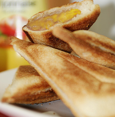 2片吐司涂上花生酱,夹入生菜和香蕉,将其按对角切出2个漂亮的三角形,好拉!美味可人的飞碟包就出来了。
