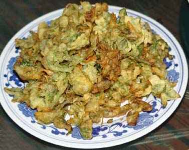 北京传统应时小食。以春季香椿树嫩叶裹稀面糊炸食。明《五杂俎》“燕齐人采椿芽食之以当蔬”。《本草纲目》“椿叶香甘可茹”。清《帝京岁时纪胜》“香椿芽拌面筋,乃寒食佳品。“寒食节”在清明节前一二日。京人吃香椿还有切末与鸡蛋同炒法、切末拌过水面法等多种。其品气味清香,无他味可比,实为春季尝鲜之美品。明代宫廷亦有民间温室专供此莱,《帝京景物略》“元旦进椿芽、黄瓜,一芽一瓜,几半千钱。”