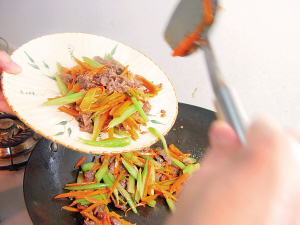 续添2汤匙油烧热,牛肉倒下锅炒至肉变色,倒入芹菜、红萝卜和3汤匙清水大火快炒30秒。